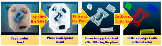 After the scene point cloud has been created and processed by the pass-through filter, statistical outlier removal filter, and voxel grid filter to achieve the proper view of the region of interest, the object’s point cloud will be segmented from the scene point cloud by combining the random sample consensus (RANSAC) [11] and the Euclidean cluster extraction algorithms [12].
