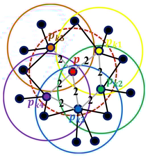 where the weight, , indicates the distance between point and the neighbor point . Figure 5 shows the effect area of the FPFH algorithm. In the figure, the query point only linked with its direct neighbors (inside the red-dashed circle). Each of the neighbors, (in the figure, they are displayed with different colors with their own circle of region), are linked with their own neighbors. The resulted histogram is weighted together with the histogram of the point to estimate the FPFH value. The gray connections marked with number 2 between the point and its neighbors together have a weight twice as large as other normal connections. The FPFH value of each query point will be analyzed in the next stage of the study.