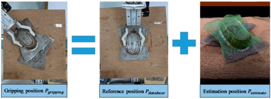 First of all, the gripping position, , needs to be recognized. To achieve the gripping pose, the point cloud of the object in the reference position has to be considered. The robot arm will be set to this position and its coordinates will be saved to the database for calculating the later position change of the object. After the pose estimation system figures out the relative position differences between the target point cloud and the reference point cloud, the gripping position of the target object, , will be calculated as the sum of the reference position stored in the database, , and the relative position, . Equation (24) and Figure 6 describe the grab position of the target object.