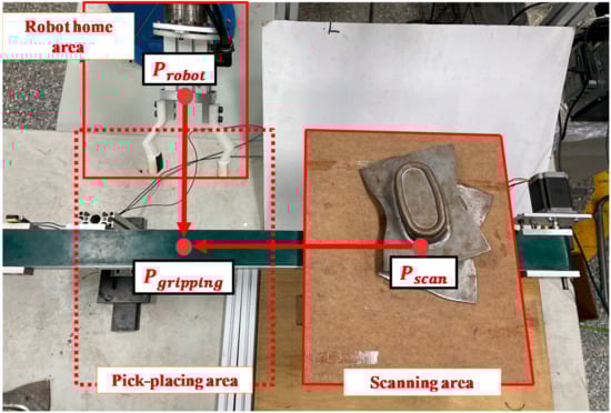 Figure 7 depicts the home position of the robot, , and the scanning position of the conveyor, , to the gripping position, . These positions, and , need to be known in advance and pre-set in the database to synchronize the operation of the robot and the conveyor.
