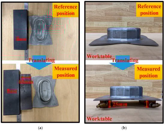 Firstly, the three translation axes X, Y, Z errors are considered. As shown in Figure 8a for the X and Y-axis, the workpiece is initially placed next to the base which is considered to be the reference position; afterward, place a block next to the base which will enable the workpiece to move a distance of 60mm (width of the block is 60mm). Then compared to the reference position, the workpiece is moved 60mm (the new position that needs to be measured); continue the experiment with other distances of 120mm, 180mm, and the other direction of −60mm, −120mm, −180mm. Figure 8b displays the experiment for Z-axis. Similar to the experiment of the X and Y-axis, this experiment also uses a block to move the workpiece but in the vertical direction (Z-axis) and the base now is the worktable. The experiment is carried out by using a block with height of 25mm. The distances of experiment are 25mm, 50mm, 75mm, 100mm, 125mm, and 150mm. Both in the reference and measured position, the workpiece point cloud is modeled for later recorded the error between the real distance and estimating distance.