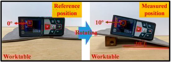 Now, considering the rotation axes RX, RY, and RZ, the experiment setup for these axes is shown in Figure 9. The worktable is now recognized as the base and the reference position is where the workpiece is placed on the worktable. The experiment used the BOSCH rangefinder (Bosch, Germany) to estimate the angle. For the reference position, the rangefinder shows 0°. Thereafter, the workpiece is rotated by placing a block under its side. Now, the new position angle will be shown on the rangefinder. The experiment was conducted with the angles of 30°, 20°, 10°, −10°, −20°, and −30° for the RX and RY axes and 10°, 30°, 45°, 60°, 75°, and 90° for the RZ-axis.