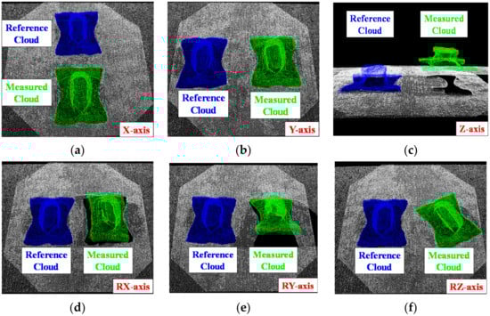 Building reference point cloud models of each 6-DoF pose for estimating measured clouds of the dynamic workpiece in the (a) i-axis, (b) Y-axis, (c) Z-axis, (d) RX-axis, (e) RY-axis, and (f) RZ-axis.