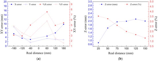As shown in Figure 11, the translation error of the pose estimation of this study is considered to be reasonable and can be used in practical applications. Figure 11 confirms that the error of the translation axis ranges between 0.825 and 9.834 mm and 0.825~5.810%, and the average error is 5.417 mm and 4.850% for the X-axis, 4.001 mm and 3.513% for the Y-axis, and 1.570 mm and 2.214% for the Z-axis. The trend of Figure 11a points out that in the X and Y axes, the larger the distance between the reference and the measured points, the higher the error of the system. On the contrary, a smaller distance will lead to a higher error percent in the system. The same trend appears in the error of the Z-axis (Figure 11b).