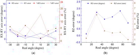 Figure 12 demonstrates the rotation error of the system. For the RX and RY axes (Figure 12a), and the RZ-axis (Figure 12b), the errors are small if the real angle differences are small, but the error percent will increase when the angle differences decrease. The error and error percentage of the rotation axis range 0.13°~2.67° and 0.37~16.40%, respectively. The average error and error percentage of the RX-axis are 1.36° and 6.38%, respectively, the average error and error percentage of the RY-axis are 1.01° and 6.01%, respectively, and the average error and error percentage for the RZ-axis are 1.21° and 2.59%, respectively.