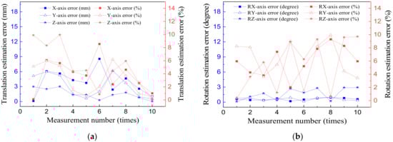 Repetition error and error percentage of the 6-DoF pose estimation system: (a) translations of X, Y, and Z axes, and (b) rotations of RX, RY, and RZ axes.