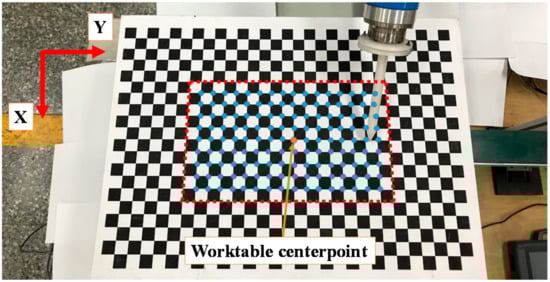 As mentioned in Section 2.4, we utilized the non-linear correction algorithm to compensate for the robot error. Figure 14 demonstrates the robot error experiment setup. First, the checkerboard (side of each square is 20 mm) is placed on the worktable; then, the worktable center point is considered to be the centroid and does not have an error (meaning in the worktable center point, ).