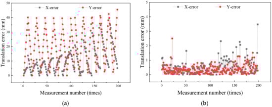 After applying the coefficient matrix to the calculation, the robot’s positioning accuracy significantly improved. 0a shows the robot error before using the compensation function. As can be seen, the error of the robot was very large, up to 39.69 mm on the X-axis and 45.45 mm on the Y-axis. The average error without correction was 10.55 and 20.86 mm on the X-axis and the Y-axis, respectively. On the other hand, 0b demonstrates the sharp enhancement of the robot positioning. Compared to before compensation, the average translation errors can now reduce by over 20 times with the X-axis and 40 times with the Y-axis, to 0.49 and 0.37 mm on average, respectively. The maximum errors were also downgraded to 3.47 and 2.50 mm for the X and Y axes, respectively.