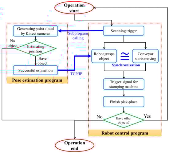 Flow chart of pose estimation and robot control programs for the dynamic workpiece feeding control system.