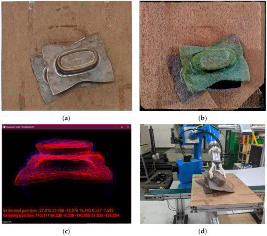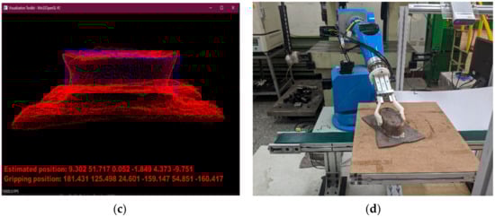 There were two experiments—the first with a single object and the second with a stack of two objects. Figure 18 and Figure 19 show cases where the robot successfully picked up the object to stamping die with single and piled objects, respectively. Figure 18a and Figure 19a show the workpieces that were placed in random positions, Figure 18b and Figure 19b show the scene point cloud of each case, Figure 18c and Figure 19c show the results of the pose estimation system, and finally, Figure 18d and Figure 19d show the images of the robot successfully picking up the object.