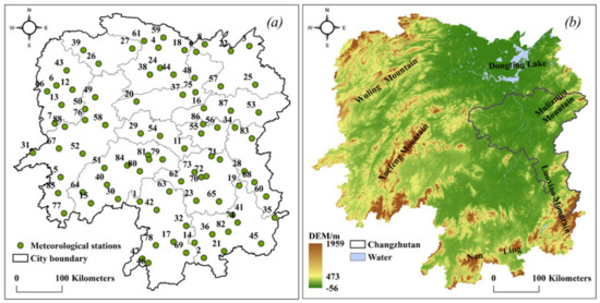 Hunan Province (108°47′–114°15′ E and 24°38′-–30°08′ N) (Figure 1) is situated in the middle reaches of Yangtze River in China. It is surrounded by mountains in the east, south, and west; the central hills are undulating, and the northern lake basin is flat. The northeast opening presents an asymmetrical horseshoe-shaped basin, with four rivers running through the territory (Figure 1b) [41]. The study area has a subtropical monsoon climate, with an annual average temperature of about 16 °C–18 °C and annual rainfall of 1300–1600 mm [39].