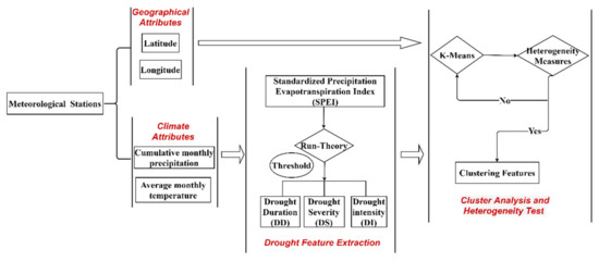 The methodology adopted in this study consisted of two parts (Figure 2). The first part was used to extract drought temporal features by integrating the run theory with the SPEI drought index. The second part was implemented to derive drought spatial patterns by clustering drought characteristics and the latitude and longitude properties of the meteorological stations. The details of Parts 1 and 2 are presented in Section 3.1 and Section 3.2, respectively.