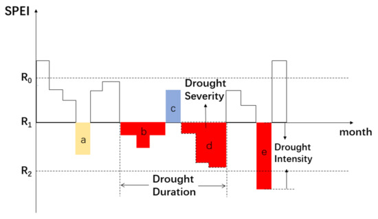 If the values of SPEI-1 are less than R 1 , they will be regarded as drought preliminary events (preliminary judgments), as shown in Figure 3, where a , b , d , and e denote four drought preliminary events.
