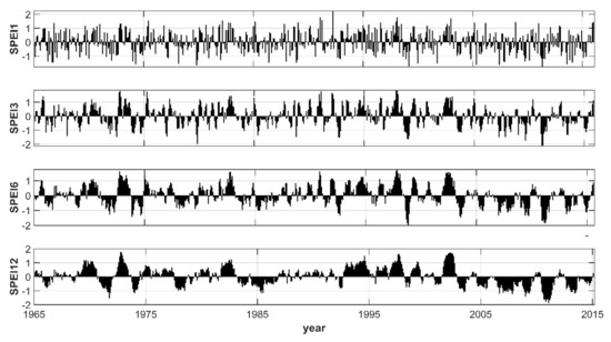 Figure 4. SPEI profiles with different time scales (SPEI−1, SPEI−3, SPEI−6, and SPEI−12).