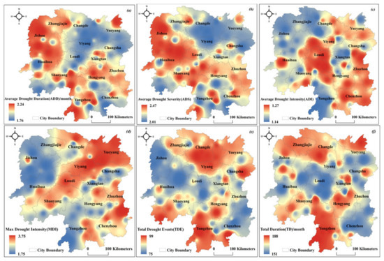 Figure 5. Spatial distribution of drought characteristics in Hunan: (a) ADD, (b) ADS, (c) ADI, (d) MDD, (e) TDE, and (f) TDD.