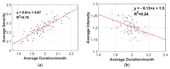 Figure 6 shows the ADD, ADS, and ADI linear fits of all stations. Given that intensity is the accumulation of severity, with the extension of ADD time, drought turns to a wet state or returns to the normal state. Hence, ADD and ADS are positively correlated (R2 = 0.76), but ADD and ADI are negatively correlated (R2 = 0.24).