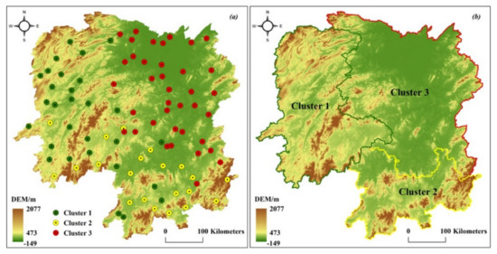 The clusters of the meteorological stations are shown in Figure 7a, and they are divided into three clusters in terms of geography (Figure 7b) as per city boundaries. Cluster 1 includes most of the western meteorological stations, Cluster 2 includes the northeast stations, and Cluster 3 includes the southern stations. This clustering result is consistent with the division of the economic zones and landform types of Hunan [53]. Cluster 1 is located in undeveloped economic conditions where landforms are dominated by mountains and plateaus. Cluster 2 is in less-developed economic conditions where landforms are surrounded by mountains and plains. Cluster 3 is located in well-developed economic conditions where landforms are dominated by basins and hills.