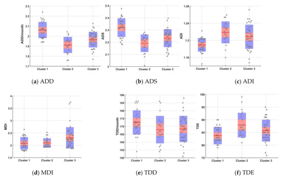 Figure 8. Box plot of station drought characteristics of the three clusters (average drought duration (a) (ADD), average drought severity (b) (ADS), average drought intensity (c) (ADI), max drought intensity (d) (MDI), total drought durations (e) (TDD), and total drought events (f) (TDE).