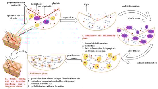 According to Figure 1, the first phase represents the moment of inflammation and cessation of bleeding, involving processes such as vasoconstriction, platelet aggregation, and subsequent coagulation of the aseptic wound by phagocytosis and debridement (it can take up to five days depending on the treatment applied). The second phase represents the actual healing, being the stage of cell proliferation. In this phase, the fibroblasts determine the synthesis of collagen, which “fills” the wound, and then the formation of angiogenesis takes place. Subsequently, the size of the wound decreases due to the contraction process—the collagen fibers are reorganized so that later, the epithelialization takes place (this process requires between 2 and 10 days depending on the treatment applied). The last phase is the remodeling phase, when the collagen synthesis is low but the collagen fibers generated by fibroblasts are firmer and more elastic, and the skin regains its elasticity [].