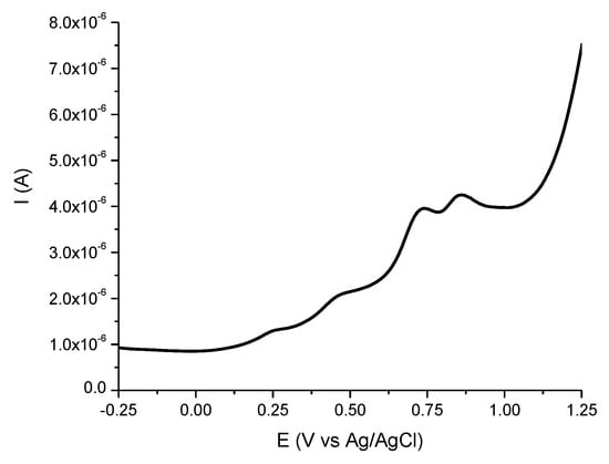 The extract was analyzed by differential pulse voltammetry (DPV) (Figure 2), revealing the oxidation process of the chemical compounds with a reducing character from the extract composition. A total of four peaks can be observed (two small shoulders and two better-defined peaks) at different potentials (at around 0.250 V, 0.450 V, 0.700 V, and 0.850 V, respectively) and with different intensities. The peak from around 0.450 V can be attributed to ascorbic acid oxidation, leading to a content of 0.47 ± 0.003 µg/mL. The value of AEAC was 26 ± 0.02 µg/mL, which indicates an important antioxidant capacity of SM extract, in accordance with other studies employing spectrophotometric methods [,,,].