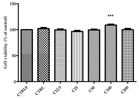 The effect of different SM extract concentrations, ranging between 12.5 µg/ML and 200 µg/mL on cell viability after incubation for 24 h, was investigated (Figure 3). The percentage of cell viability did not change significantly compared to the control (CTRL0) except for the treatment with SM at 100 µg/mL, in which a significant increase (p < 0.001) in cell viability (%) of NHDF (normal human dermal fibroblasts) was observed.