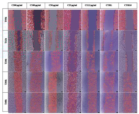 The evolution over time (0, 12, 24, 36, and 48 h) of cell wound coverage at different concentrations of Stellaria media (L.) Vill extract (range 200 µg/mL–12.5 µg/mL) compared to positive control (CTRL)—treated with allantoin 50 µg/mL and untreated wound control (CTRL0). Fibroblasts marked in pink are those that have mobilized into the wound. The scale of the processed images is 100 µm.