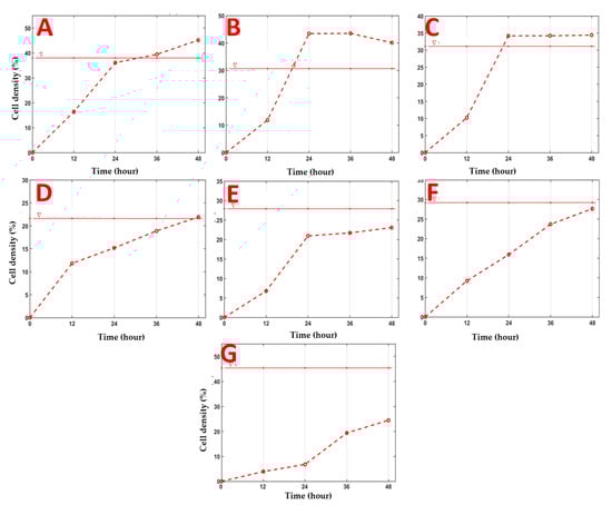 The evolution of the cell density parameter inside the wound depending on the applied treatment and time. The horizontal red line represents the initial density of the cells before the application of the “scratch” test, and the dotted red line represents the evolution in time of the cell density (%) depending on the applied treatment. Stellaria media (L.) Vill extract was applied in concentrations of: 200 µg/mL (A), 100 µg/mL (B), 50 µg/mL (C), 25 µg/mL (D), 12.5 µg/mL (E), Positive Control (CTRL), 50 µg/mL Allantoin (F), and control (CTRL0) (G), without any treatment.