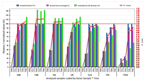 The value of the Lp norm—a quantitative parameter that allows the classification of samples taking into account the three normalized variables: coverage of the relative width of the wound (%), coverage of the wound area (%), and the normalized density of the cells inside the wound (%) for the removal of errors that may occur in univariate statistical analysis—was calculated with the data presented in Figure 6.