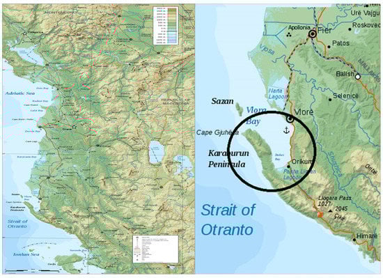 A total of 1075 fish specimens of 10 different teleost species were collected from different sites on the coast of the Karaburun Peninsula located in the Valona district during 2016–2020 (Figure 1). Two of the fish specimens (Dicentrarchus labrax and Sparus aurata) were farmed fish and were reared in floating cages. Eight species (Merluccius merluccius, Solea vulgaris, Scomber scombrus, Mullus barbatus, Engraulis encrasicolus, Sardinella aurita, Trachurus trachurus, and Scomber japonicus) were collected with gillnets in the surrounding waters.