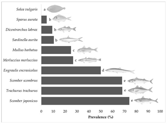 Prevalence (%) of anisakid L3 type I larvae in the fish species. Bars sharing the same letters are not significantly different (p < 0.05).