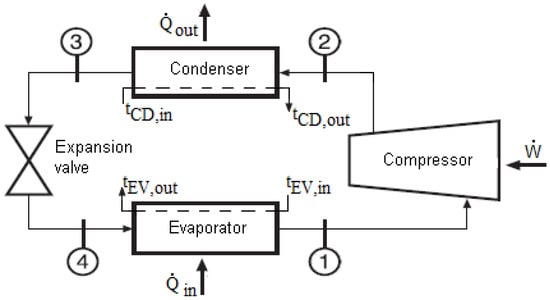 Schematic of the investigated vapor-compression refrigeration system: 1–4—stream numbers.