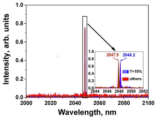 In our experiment, the influence of different output transmittances on M2 of diode-pumped Ho: GdVO4 laser has been investigated, as shown in Figure 7. Through the comparison of different groups of the slope efficiency, an optimal result was reached by using the output couple with the output transmittance of 50%. When the pump power was 15 W, the laser obtained the maximum output power of 1.8 W, with a slope efficiency of 39.5%. It is worth noting that the slope efficiency here is for the absorbed pump power. In the case of transmittance of 30 and 10%, the output power dropped to 1.6 and 1.1 W, and the slope efficiencies at this time were 33.8 and 19.7%, respectively. With optical spectrum analyzer, the output spectra of diode-pumped Ho: GdVO4 laser were recorded under different transmittances. It can be seen from Figure 8 that, when the transmittance was 10%, the center wavelength of the laser was located at 2048.2 nm. As the transmittance increases, the center of the spectrum moves to the shortwave direction to 2047.9 nm. The blue shift of output wavelength is mainly caused by absorption loss in quasi-three-level system of Ho laser. No obvious wavelength fluctuation was observed with the three output couplers used in the above experiment.