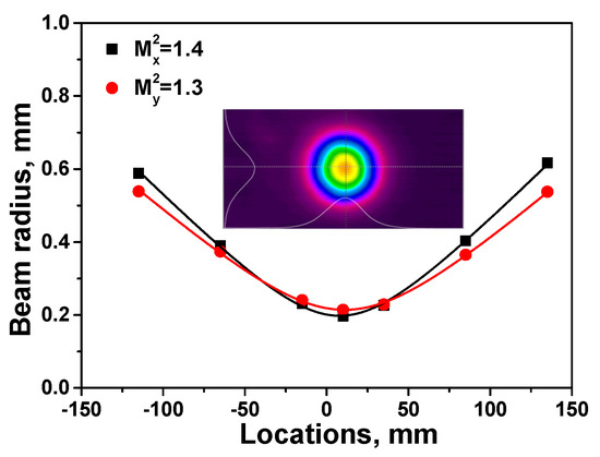 To further determine the beam quality factor M2, we used a lens (focal length: 150 mm) to converge the laser beam. With the maximum output power, the output beam radii were measured at several positions through the 90/10 knife-edge technique. Then, the data were fitted by the Gaussian beam standard expression. The fitting results are shown in Figure 9. It can be seen from Figure 9 that the beam quality M2 factors in x- and y-directions are 1.4 and 1.3, respectively.