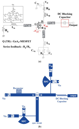 In this study, a low-phase-noise X-band oscillator was designed using a new high-QL resonator, as shown in Figure 7. As shown in the figure, an oscillator was used for the series feedback structure and self-bias method, and the series feedback at the source was chosen as an oscillator, which provides the negative resistance (−R) to the gate of a GaAs-MESFET.