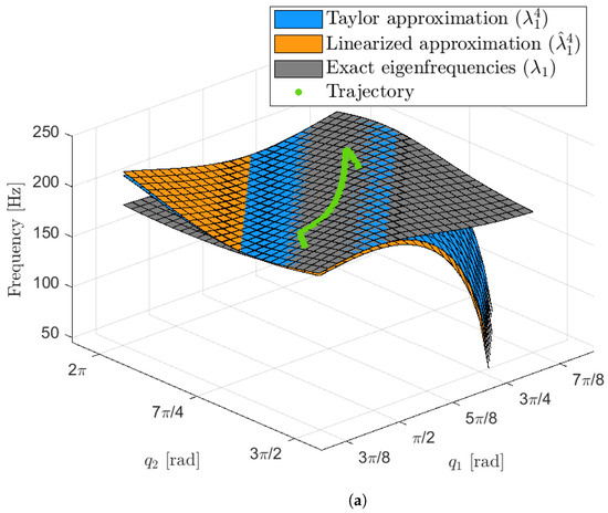 The 4th order Taylor polynomial () of the lowest eigenfrequency (), i.e., , and the partially linearized polynomial, i.e., , are compared with the actual eigenfrequency of the multibody system. For clarity of representation, the approximations are compared in two ways. In Figure 3, variable varies in the domain , while is fixed at the value (no point masses are added at the joints). If the comparison is restricted to the points of the trajectory, represented in the figure by the green line, the maximum relative error is for and for .