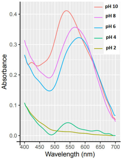 Visible spectra of five samples with different pH values (here the pH values were adjusted after the preparation of AuNPs with an initial pH of 10). The samples were diluted 1:2 with ddH2O.