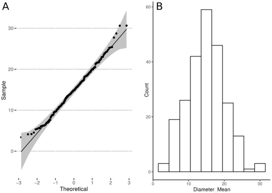 Particle analysis of TEM images of a washed sample at pH 6 (pH was adjusted after the AuNPs were prepared). The probability plot (A) and histogram (B) confirmed an approximately normal distribution of the mean diameter of the particles.