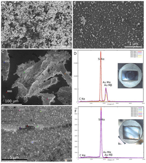 SEM and EDS images of different samples. (A) SEM results of a washed pH 2 sample of glow-discharge-activated silicon wafer. (B) SEM results of a washed sample at pH 10 from glow-discharge-activated silicon wafer. (C,D) EDS analysis of a washed sample on a non-activated silicon wafer support. Drying the sample on a hydrophobic surface resulted in the formation of large aggregates of AuNPs at the edge of the dried sample. The individual spot positions marked in (C) and the corresponding spectra can be seen in (D). (E,F) EDS analysis of a washed sample at pH 10 on an activated silicon wafer support. The aggregation of AuNPs at the edge of the sample was minimized; however, the Au signal from the individual AuNPs was weak, while the intensity of the Si Kα peak from the silicon wafer support was predominant. The inserts in (D,F) show the effect of non-activated (D) and activated (F) silicon wafer supports on the final SEM sample formation after air-drying. Scale bars: (A,B) = 1 µm; (C) = 100 µm; (E) = 5 µm.