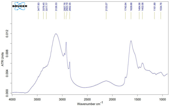 The sample at pH 10 was chosen for FTIR analysis, and the results are shown in Figure 7. The FTIR data confirmed the presence of capping agents on the surface of the AuNPs. Since the FTIR spectra of the AuNPs were recorded in aqueous dispersion, the water spectrum was subtracted as a background, but there were still some water peaks present in the spectra. In particular, the peaks at 3400 cm−1, 2123 cm−1, and 1630 cm−1 correspond to water. The peak 2123 cm−1 corresponded to the combined band of O–H scissors–bending and the broad liberation band shown previously [36]. The broad band between 3800 and3000 cm−1 was caused by O–H stretching: the shoulder at approximately 3300–3400 cm−1 was from the solvent water, while the narrower peak at 3100 cm−1 corresponded to the O–H stretching of the carboxylic acids. Three narrow peaks at 3000 cm−1 represent the C–H (CH3) stretching vibrations of the capping agents present. In the region of the amine bands, there was an indication of the presence of C=O vibrations (1740 cm−1) as well as an N–H bending peak (1550 cm−1), which leads us to believe that the capping agent may be proteinous in origin.