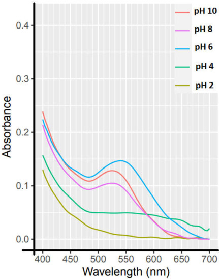 The absorbance curves of the samples were recorded using a NanoDrop spectrophotometer at 400–700 nm. Figure 2 shows the obtained spectra of AuNPs prepared at different pH values (i.e., pH 2, 4, 6, 8, and 10). Most of the spectra showed MAP, but the best one was for the sample with pH 10 at 536 nm. These differences in the AuNP MAPs are related to their unique LSPR properties.