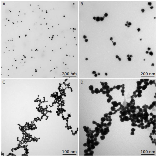 As shown in Figure 4, the gold nanoparticles were not agglomerated at pH 2 before washing (Figure 4A), but they agglomerated afterwards (Figure 4C,D), indicating that they were unstable at the corresponding pH. The insert in Figure 4A shows some closely connected AuNPs without distinct boundary lines. This is in accordance with the observation from spectrophotometry as well as the results of Murphy et al. [31] (see Figure 2). However, we did not perform TEM for the sample with an initial pH of 4, and thus we cannot conclude that the AuNPs at pH 4 were rod-shaped (according to Murphy et al.), but the size distribution assay (see Figure 14) showed that that they were polydispersed and their sizes were over 100 nm.