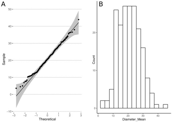 Particle analysis of TEM images of washed sample at pH 6 (the pH was adjusted before the preparation of the AuNPs). The probability plot (A) and histogram (B) confirmed an approximately normal distribution of the mean diameter of the particles.