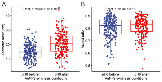 Blue dots correspond to the nanoparticles that had a pH value that was adjusted before AuNP preparation, and the red dots correspond to nanoparticles that had a pH value that was adjusted after AuNP preparation. (A) The mean diameter of AuNPs prepared at pH 6; (B) the aspect ratio of AuNPs prepared at pH 6.