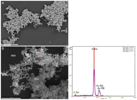 SEM and energy-dispersive X-ray spectroscopy (EDS) were performed using an FEI Nova Nano SEM 450 scanning electron microscope (FEI, Brno, Czech Republic) equipped with an Ametek® EDAX Octane Plus SDD detector and TEAM™ EDS Analysis Systems (AMETEK B.V., Tilburg, The Netherlands). Using EDS analysis, the elemental composition of aggregated and individual nanoparticles was determined. Ten millimeter by ten millimeter glow-discharge-activated silicon wafers and normal silicon wafers were used for sample preparation [28]. A 10 µL drop of the sample was applied to each silicon wafer and air-dried at 56 °C for 4 h. Dried silicon wafers were glued to standard aluminum pins with conductive silver lacquer (Leitsilber, Ropertz-GmbH, Munich, Germany) and air-dried overnight at 56 °C [29].