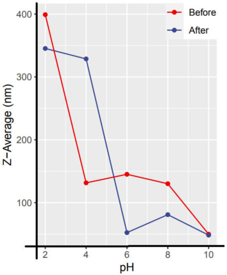 As can be seen in Figure 9, samples at pH 2 and 4 did not have MAPs, which indicates that they were polydispersed nanoparticles.