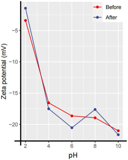Zeta potential of the obtained AuNPs at different pH values. The different pH values were adjusted before and after the preparation of AuNPs.