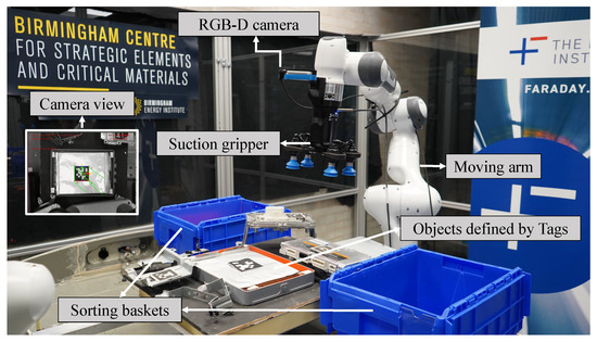 The second setup was designed to evaluate the efficacy of the proposed DHVS method for sorting application. Figure 1 depicts the experimental setup used for sorting the dismantled components of an EV battery pack (Nissan Leaf 20212). The VS has been used to guide the suction gripper towards the battery module (i.e., the object with an attached marker). Then, the battery module will be lifted and will be placed in the corresponding basket. The rationale for performing this case study is that in industry, the robot and the object that the robot is interacting with must be precisely positioned, otherwise the robot might fail in completing the task due to uncertainties in the environment.