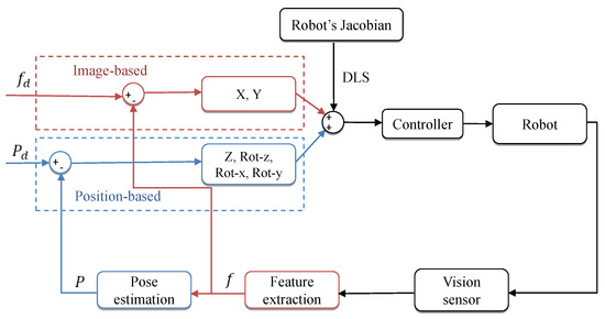 Image-based or 2D VS (IBVS), Position-based or 3D VS (PBVS), and Hybrid or 2 & 1/2D VS (HVS) are three main categories of VS control approaches. The IBVS method computes the feedback directly from extracted image-space features. This method is more resistant to the camera calibration and robot kinematic errors [10]. Additionally, image features are less likely to be lost from the image screen [11]. On the other hand, IBVS has some disadvantages; for instance, some controller commands are not physically executable for the robot (out of robot reachability) [12]. The poor conditioning of the image Jacobian matrix (Interaction matrix) might cause problems with the feature error convergence, like singularities and local minima [13]. Due to direct measurement of the camera velocities from the task space errors in the PBVS process, the interaction matrix problems (i.e., local minima and singularity) are avoided, and thus feasible trajectories for the robot can be generated [14]. In addition, any error in the camera calibration may create an error in 3D estimation of the target and consequently affects the entire tracking task [3].