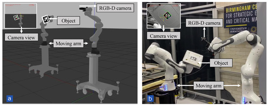In the first setup, the DHVS method has been tested in simulation and then validated in the real world. The simulation platform includes two Franka manipulators; one robot is equipped with a RGB-D camera, and another robot arm holds an object (with a printed tag marker). Four corners of the marker are used as points of interest/visual features in this study. Tracking the object under this condition has been tested via different VS methods. The experimental and simulation setups are identical. Franka robots have 7 degrees of freedom across 7 axes, with 3 kg payload, and positioning accuracy of +/−0.1 mm in all directions. The proposed method was modelled in simulation using ROS/Gazebo. ROS Melodic on Linux 18 was used for both the simulation and the experiment. The joint state controller was used to publish the joint state (at rate of 1 kHZ) and the joint velocity group controller was used to set the joint velocities computed from the VS approaches. A system with the following CPU specification was used for the visual servoing operation: AMD Ryzen 7 3700x, 8-core with 16 CPU Threads, 3.6 GHz base clock and 36 MB total cache. Figure 4a depicts an snapshot of the developed simulation environment in Gazebo, and Figure 4b shows the identical experimental setup in the real world.