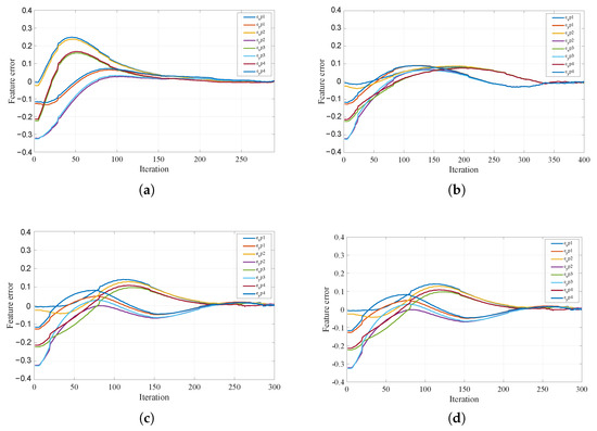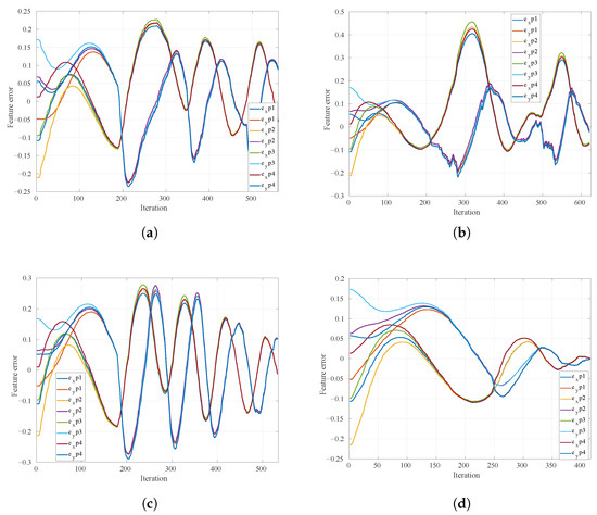 The real world result of the feature errors in different methods for the same scenario. (a) Feature errors in PBVS approach. (b) Feature errors in IBVS approach. (c) Feature errors in HVS approach. (d) Feature errors in DHVS approach.